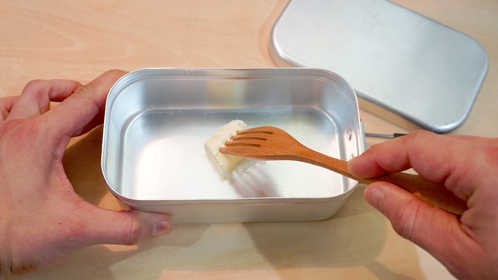 【7】【6】で作った生地をメスティンに流し込みます。ヘラを使いながら、こぼれないようにゆっくりと流し込みましょう。
