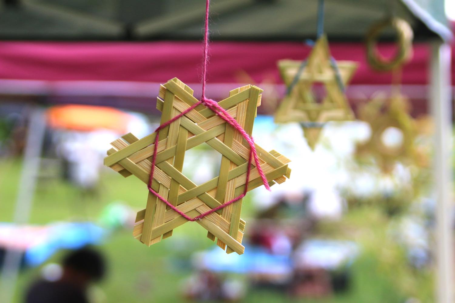 星のオーナメントはどこか北欧風。クリスマスに向けて少しずつ作りためるといいかも。7本の竹ひごで作る花かごは野の草花がよく似合う。