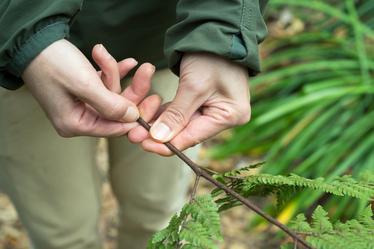 株のなかから標準的な枝ぶりの部位を選ぶ。枝の分かれ方や葉の付き方がよくわかり、花や実が付いたものがいい。しかし、あまりに立体的な枝では標本にしにくい。A3サイズに収まる大きさで採集し、ビニール袋や胴乱に収める。