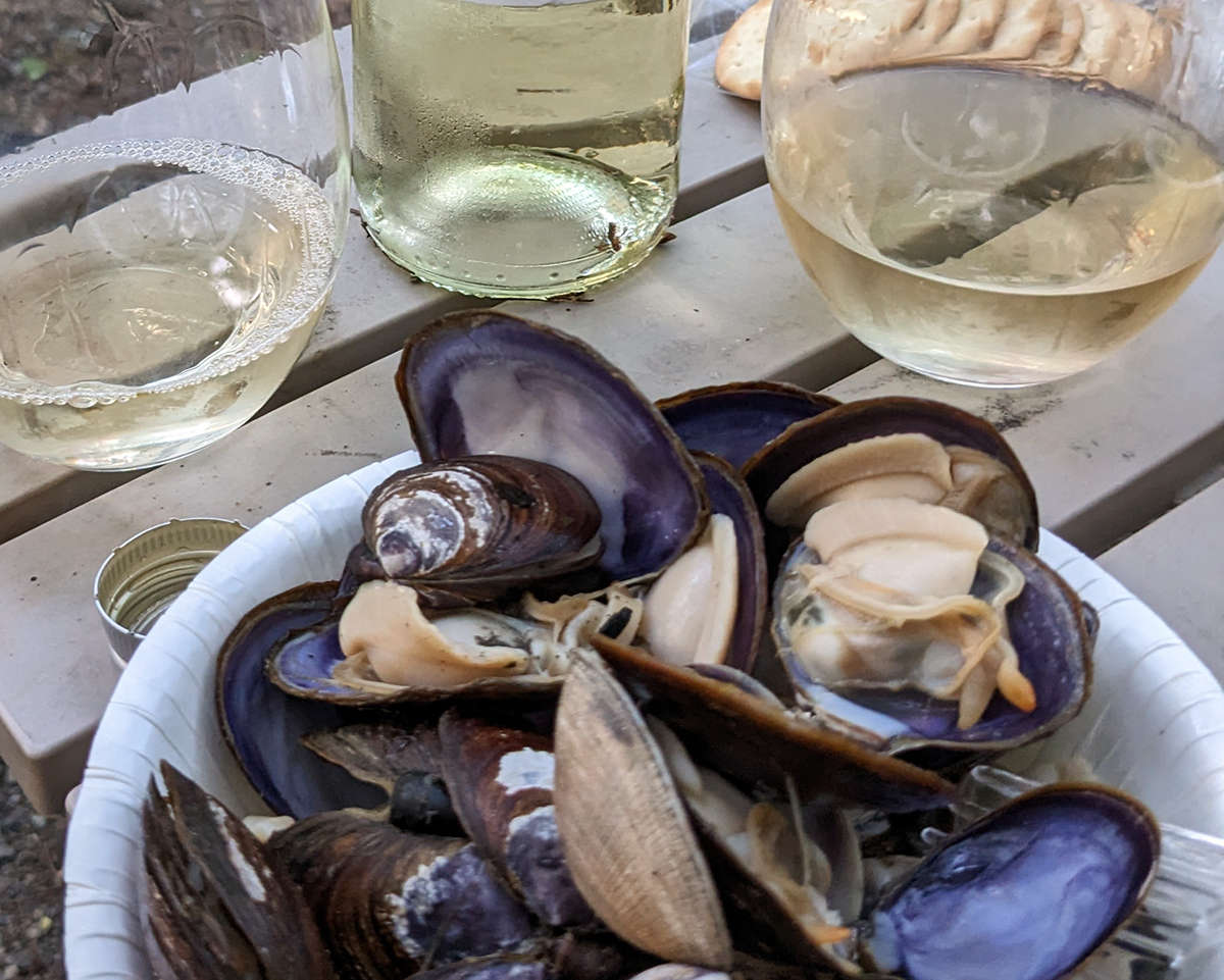 今回訪れたフッド・カナル南岸、ポトラッチ州立公園のビーチは絶好の潮干狩りスポットとして有名で、茶色っぽい見た目が特徴的な「バーニッシュクラム」をたくさん見つけることができます。日本語で「ワスレイソシジミ」とも呼ばれる貝は、日本のちっちゃなシジミのイメージからは程遠い、大粒の貝。