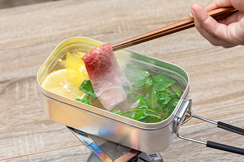【9】野菜が柔らかく蒸されたら出来上がりです。※この時メスティンはとても熱くなっているのでやけどに注意してください。