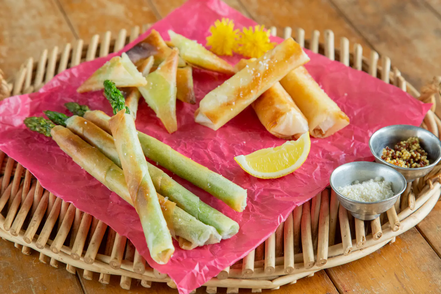 揚げたてを香りごと、そら豆、新タケノコ、グリーンアスパラガスの春巻きで旬をいただきましょう。