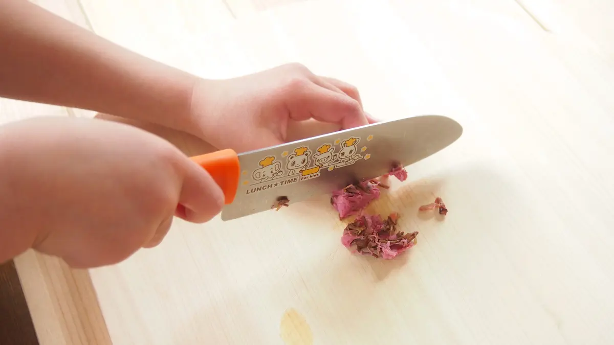 【6】生地に練り込みやすいように、桜はみじん切りにします。