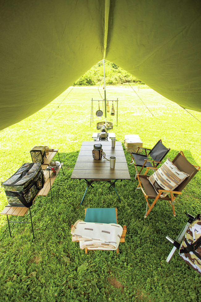 「とかく、テントとタープは同じブランド、同じカラーで揃えがちなんですが、そんな必要はまったくなし! 色のトーンを揃えるだけでまとまりは出ます。ただし、テーマを決めることは大切。今回は人気の無骨ミリタリーにしましたが、ナチュラルでもヴィンテージでもいいので、自分の好きなテーマを決めて、それに合わせてモノ選びをすれば、自ずとまとまりが出ます」