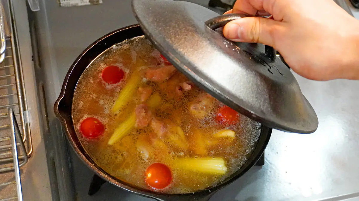 あとはフタをして弱火で20分ほど炊くだけ。汁が吹きこぼれることもあるので、スキレットの様子や火加減に注意しながら調理してくださいね。