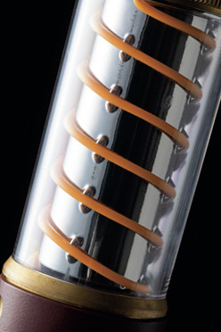 螺旋状に巻き付けられたロープ状LEDを採用。上部はフラッシュライトとしても使え、本体部と同時点灯も可能だ。7種類の点灯モードを搭載し、本革製のハンギングループが付く。