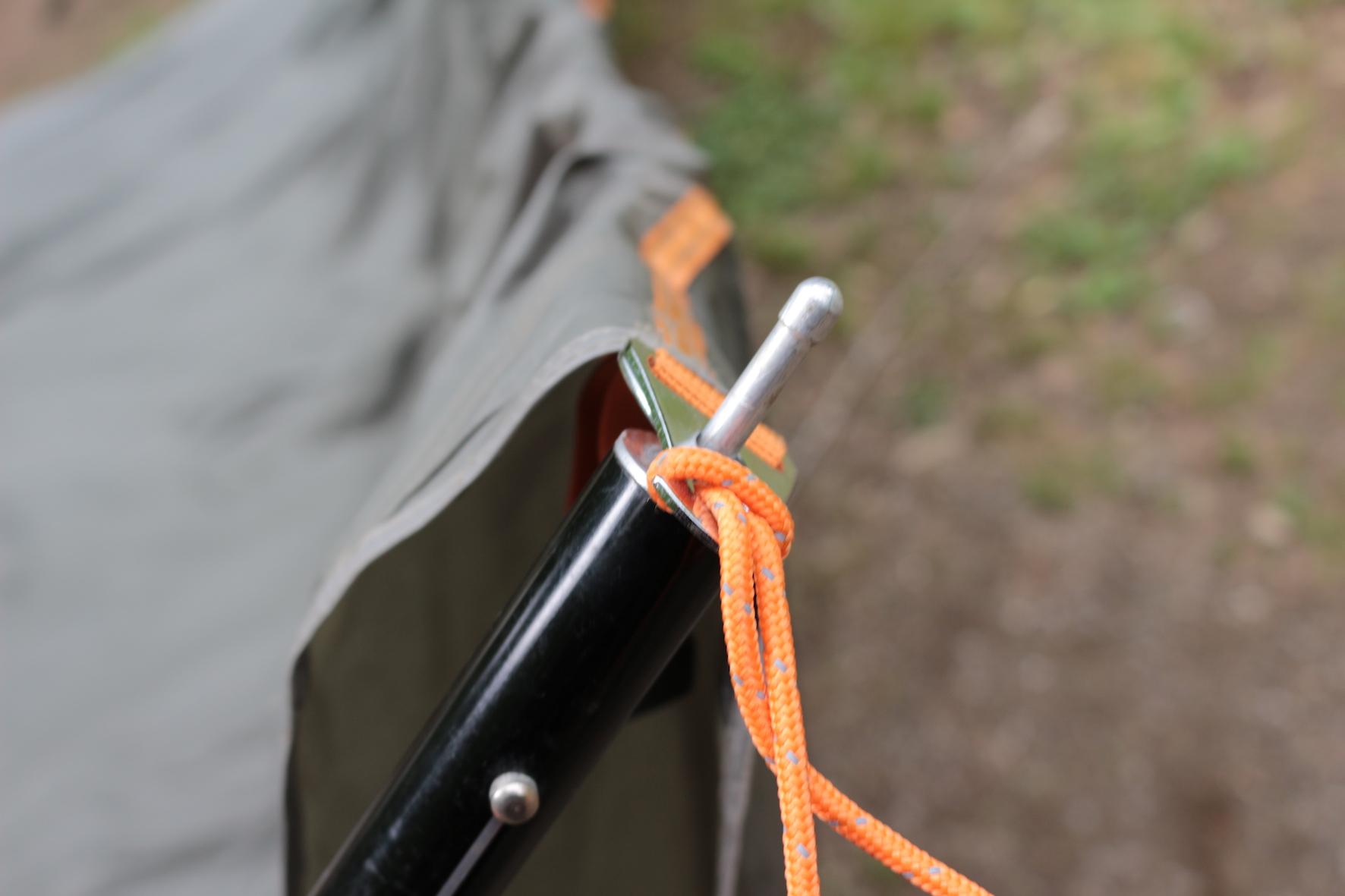 三角形のテンショナーががっちり食い込み、時間がたってもたるみにくい。タープにテントを吊すのでゆるむのではないかと心配だったが、テンションをキープできていたのは優秀だ。