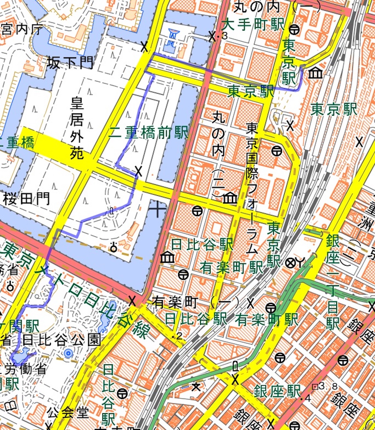 今回の目的地は、日比谷公園。登山口(最寄り駅)をどこにしようかと、地図をチェックします。日比谷公園の最寄りは日比谷駅でしょうが、有楽町駅からも10分とかからずに歩けそうです。