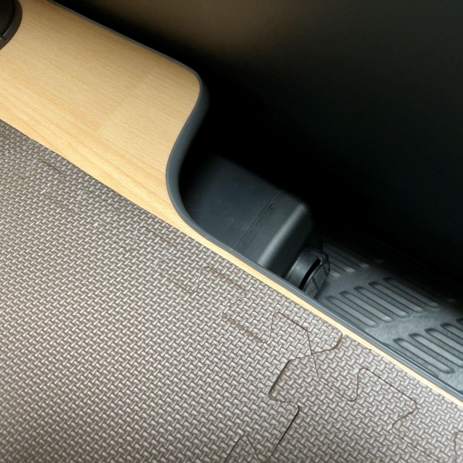 余ったマットはスクエアになるようヘリをつけて、荷物置き場のクッションにしました。