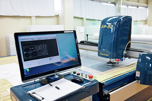 生地を広げスイッチを押すと、オートカッターが動きだす。1回でジャケット2枚分の生地をカットするという。