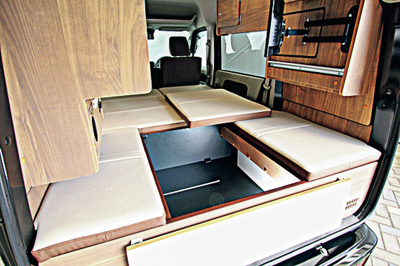 奥行き2,020㎜の大きなベッドを簡単に展開できる。ファブリックは5種類からセレクト可能。ベッド下は広大なラゲッジスペースに。
