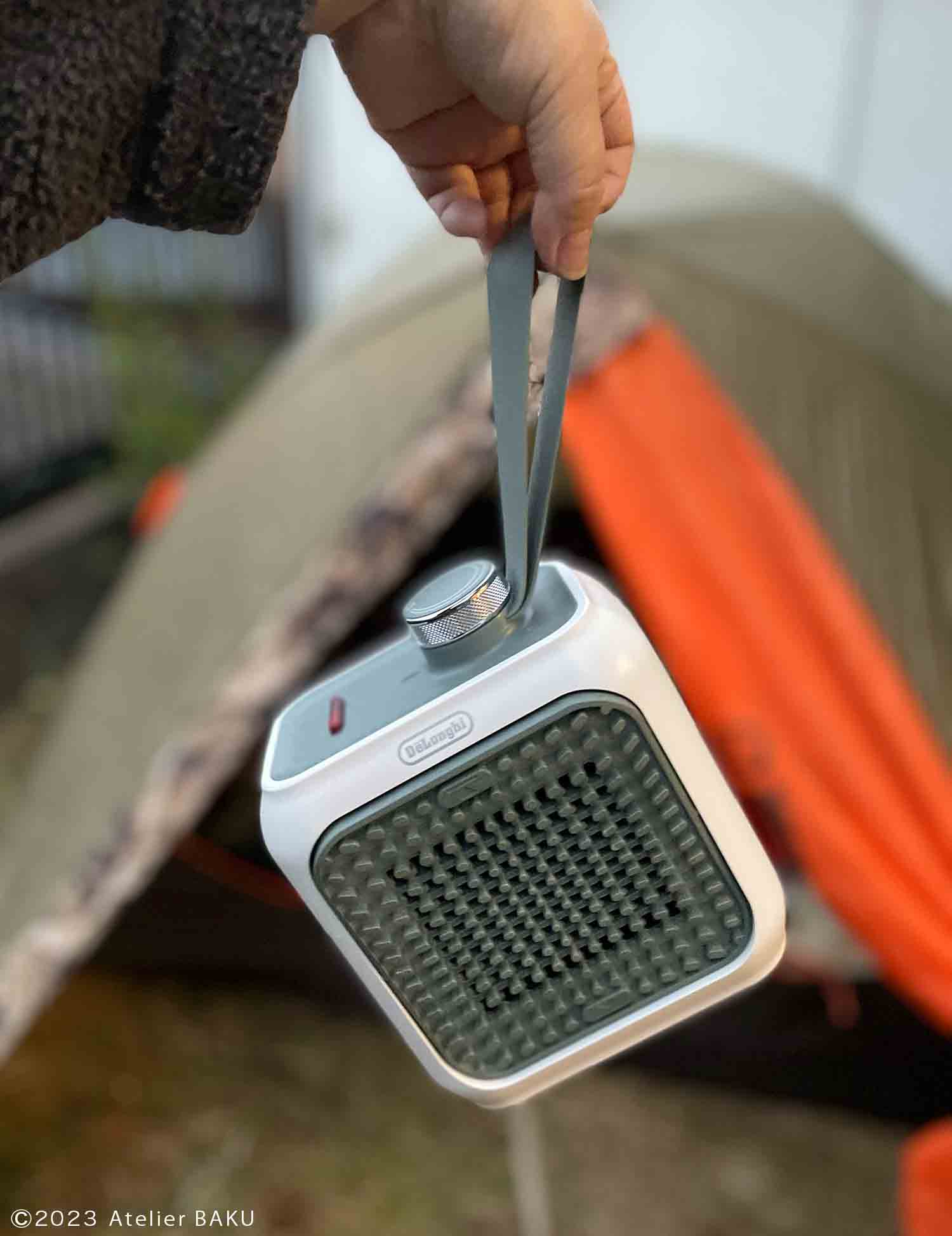高さ18cm、横幅15cm、厚さはたった11cm。コロンとした可愛らしい形で、余計な凸凹がほとんどなく、バックパックやキャリーケース、ギアボックスへのパッキングも容易。重さは917g(実測値)、ファンヒーターなのに1kgを切る軽さだ。