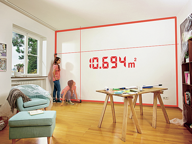 コンパクト設計のDIY用レーザー距離計。面積計測機能を搭載したモデルで、別売りのアダプターを装着すれば、15㎝以下の長さや曲面・曲線も測定できる。