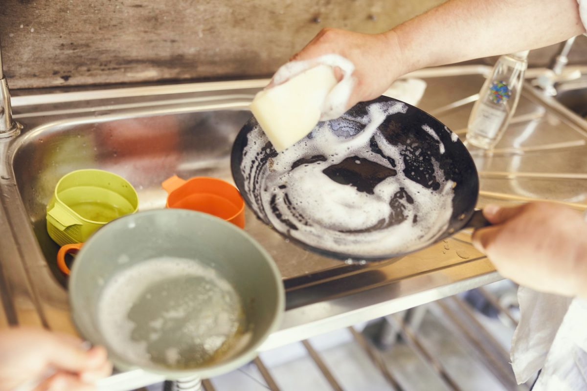 水と洗剤を節約するため、まずは汚れを古布などでさっと拭き取る。「ヤシノミ洗剤プレミアムパワー」なら、少ない量で泡立ちも抜群!