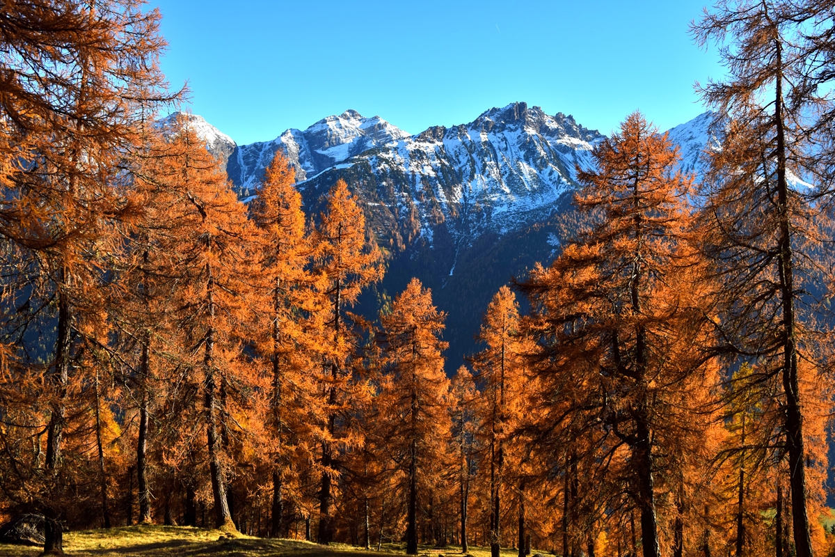 日照時間は夏の方が長いけれど、夕立の可能性が低いなど天気が安定しているため、一日が長く使えるのです。涼しいので疲れにくいのもグッド。また、写真のように、オレンジ色に染まったカラマツの黄葉を堪能できるスポットもあります。