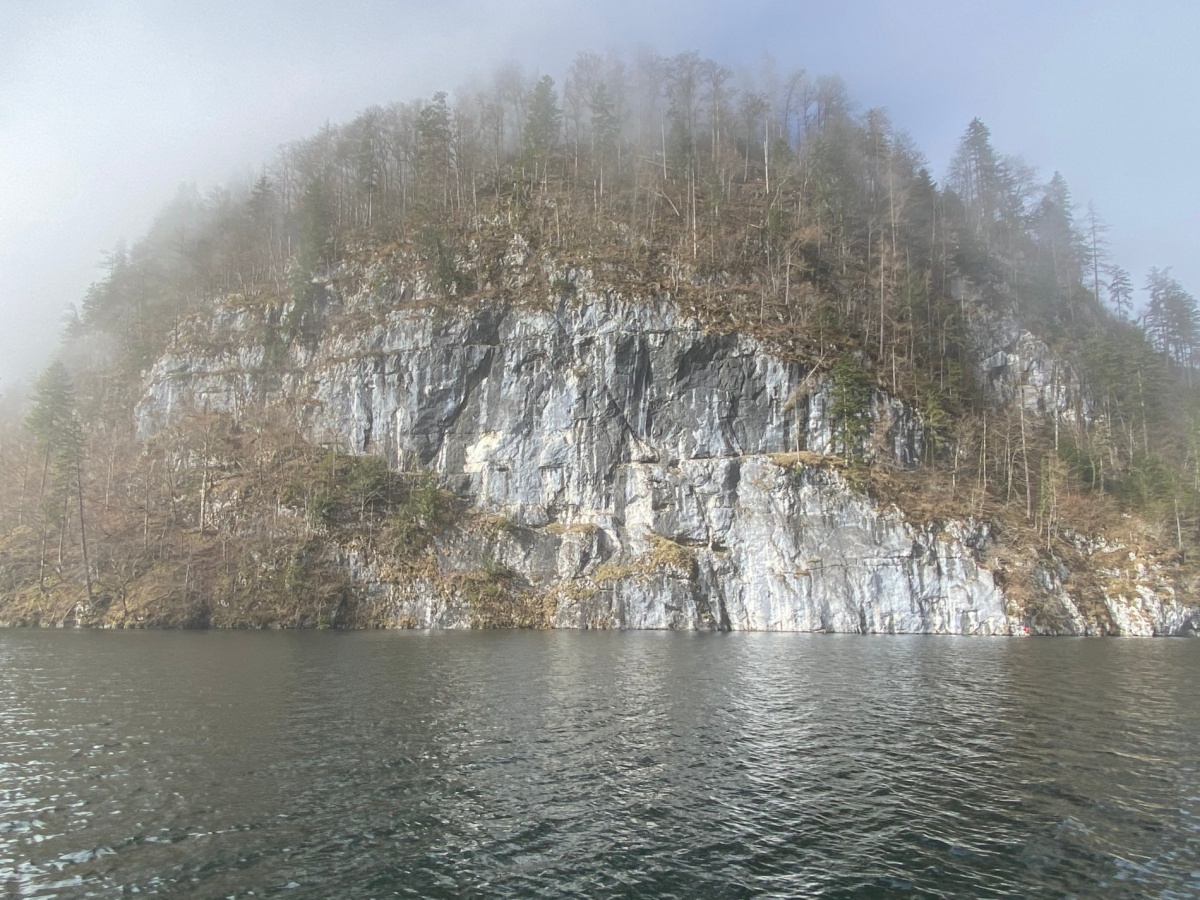 さらに船は進み、霧の影から浮くように見えてきた教会が。聖バルトロメー教会です。右後ろに見えるのは、ヨーロッパ東アルプスの北側、ベルヒテスガーデンアルプスのうち二番目に高い、ヴァッツマン(2713m)。