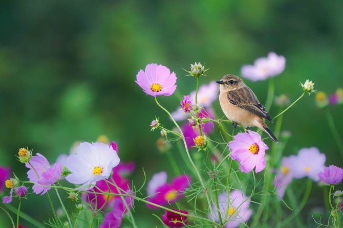 コスモスやソバなど、秋の草花とコラボするノビタキの可憐な姿を撮影してみた!