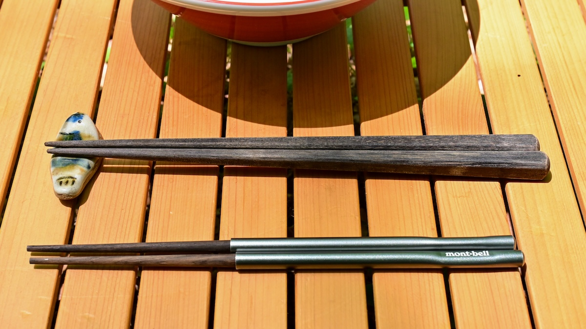 キャンプ用に作られた箸も、最近は口当たりや使い心地が良い物がたくさんありますが、ここはあえてフルサイズの箸を使ってみるのがオススメです。また、箸置きを使うだけで、食事の雰囲気がいつもよりもぐっと丁寧な時間に感じられます。