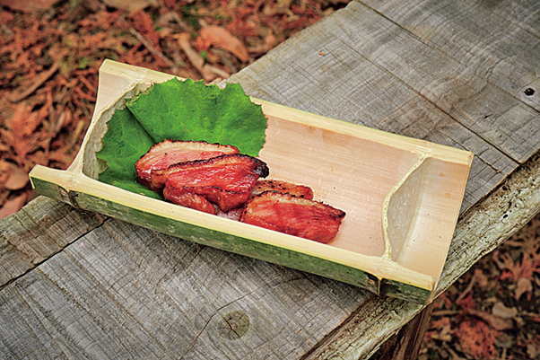 節をふたつ残して竹を切り出し、半分に割る。節の間隔や太さで好みの皿が作れる。