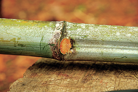 ツールハンガー用に残す枝は、節先で直角に切り落とすと切り口が滑らかになる。