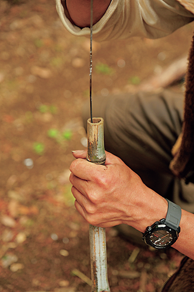 先端の節に穴をあける。鉄串を熱して焼きながらあけると小さくあけられるが大きさは好み。