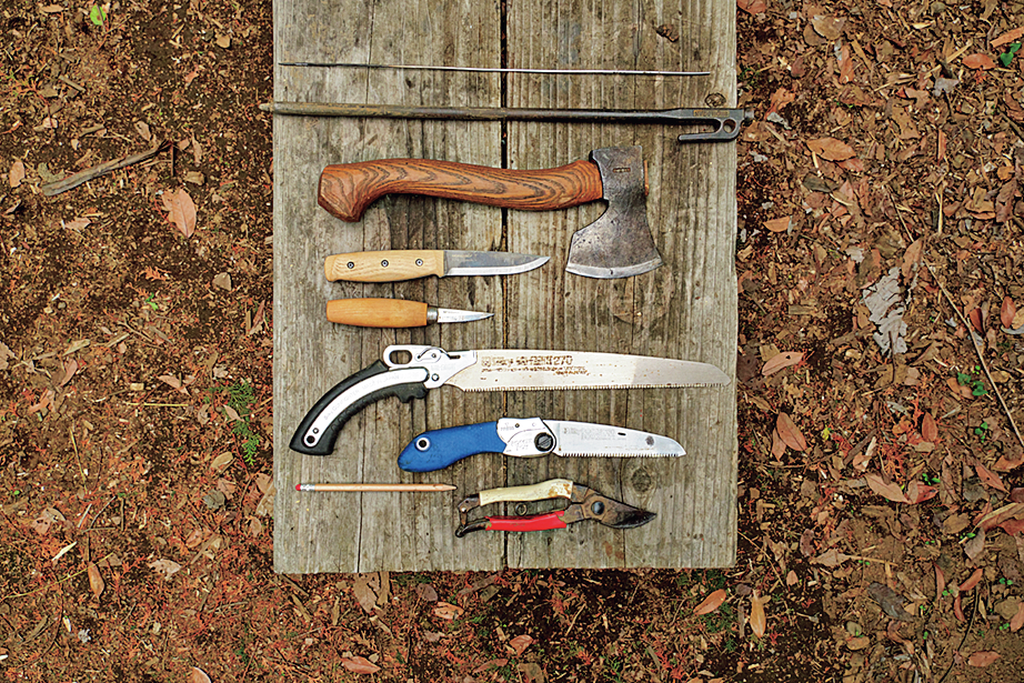右から、枝切り用の剪定バサミ、鉛筆、刃の目が細かい竹工用のノコギリ、竹専用の竹ひきノコ、細かい仕上げ用のクラフトナイフ、竹を削るためのナイフ、斧、節を割るための鉄棒(ペグでもOK)、先端に穴をあけるための鉄串(焚き火などで炙って使用)。