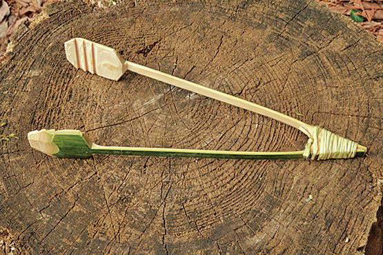 柄(2本とも)の先端に、ヒモを引っ掛けるためのV字の溝を2か所彫る。