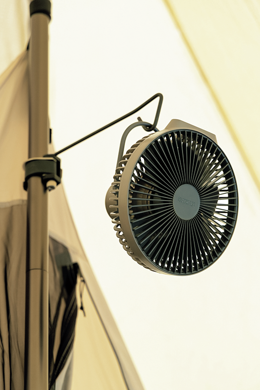置き型と吊り下げの両方に使える充電式の扇風機を持参。風がない時間帯は、これに助けられた。満充電で8時間、強風モードを使える。