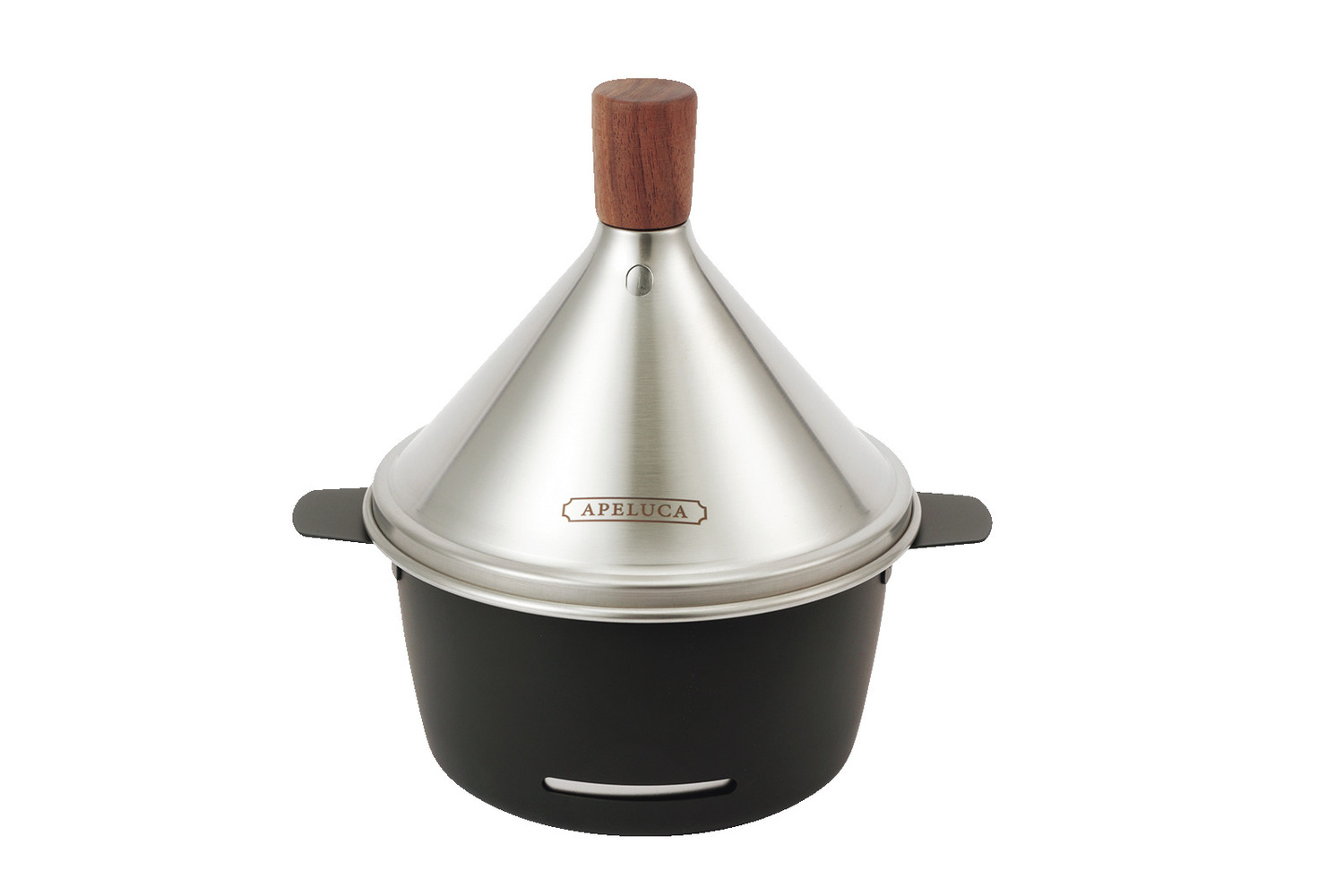 ステンレス製の鍋で、中にくん煙網が入っている。ハンドルは折りたたみ式で、収納の邪魔にならない。フタのつまみは木製なので、加熱中でも素手でフタを持ち上げられる。サイズ:直径210×高さ160mm 重量:520g