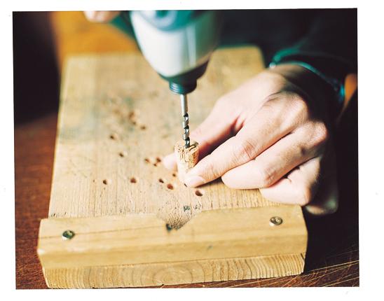 コルクを瓶にしっかりはめた状態で、上に5㎜出て、中に10~15㎜ぐらい入る長さに切る。中心にドリルで直径5㎜の穴をあける。