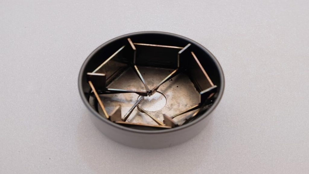 固形燃料をセット。固形燃料を使うときは、内部の底板を裏返して上げ底にした状態にする。