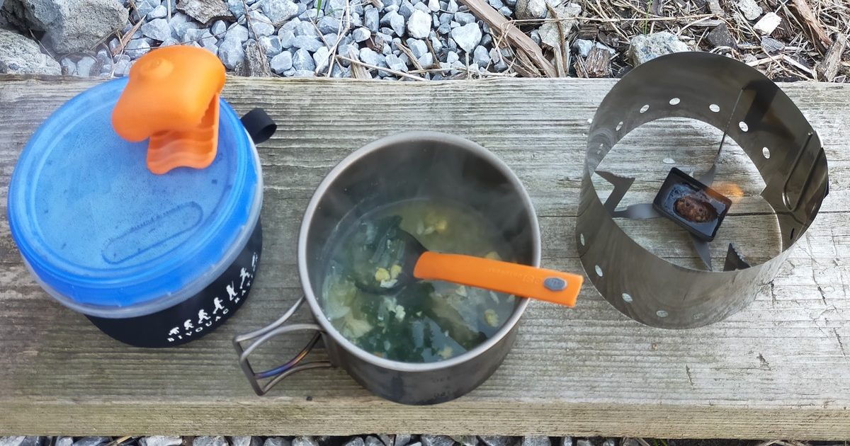 固形燃料は火力調整できないものの、圧倒的に軽く、個数によって時間を決められるので米の自動炊飯が可能。開いたフタをポットの縁にかけておけるのも衛生的だ。また、ポットは角型なので袋麺はもちろん棒ラーメンを折ることなく茹でられるサイズでもある。