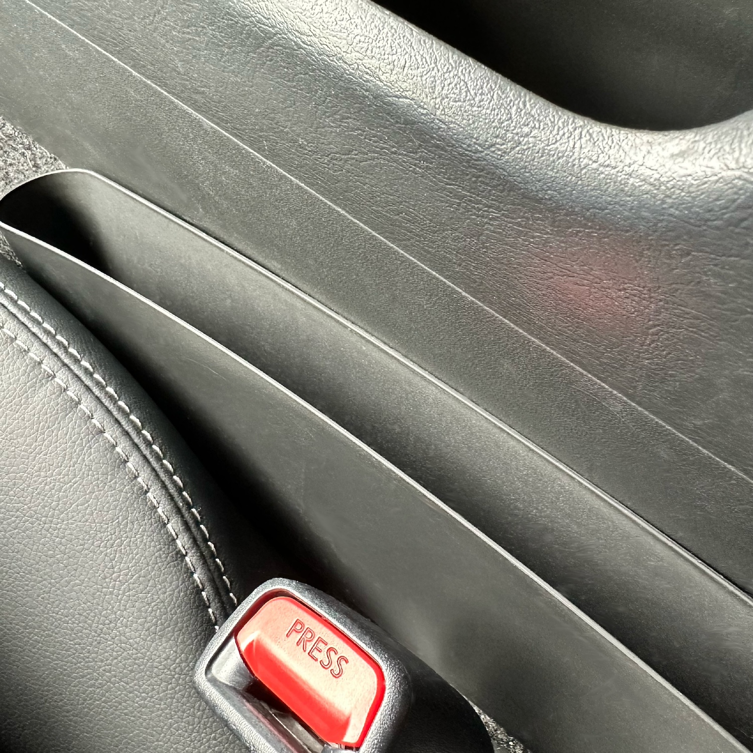 この部分、谷のような隙間になっていて、食べこぼしなどが入りやすい部分でした。奥はカーペット生地のため、掃除も大変なスポット。小物入れというよりも、汚れ防止にいい!