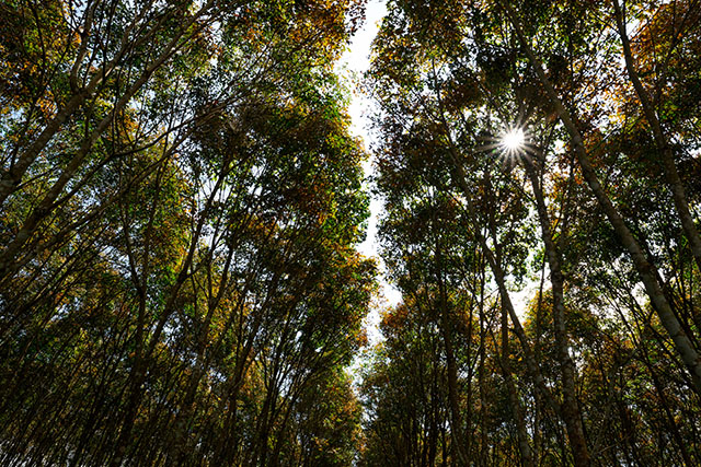 ラオスと中国の国境付近に点在する少数民族の村々を、トレッキングで訪ね歩く旅。日が高くなるにつれ、気温も上昇してきましたが、ゴムノキの林の中だと、いくぶん涼しく感じられます。