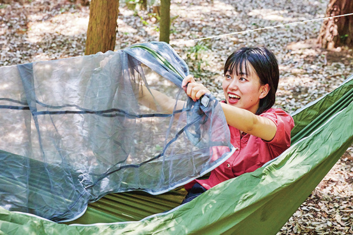 収納袋の底側を固定し、袋の開口部からハンモックをスルスルっと出して反対側の木に固定。とてもスムーズにセットアップでき、収納袋を紛失する心配もなくてとても便利だ。バグネットの片側がくの字型ポールで広げられ、頭部の空間が確保できるのがGood! バグネットは全開することも可能だ。