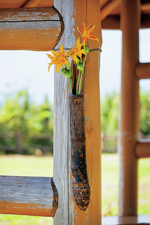 竹の根の部分を投げ入れ風の花器にしてみた。気分は千利休。水漏れする場合は、内側に拾った小ビンを入れる。