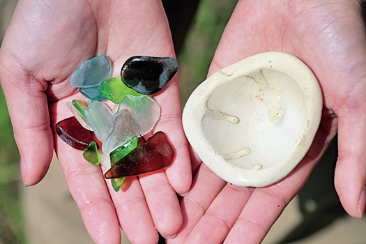 割れたガラスの角が砂に揉まれるうちに摩耗し小石状になったのがシーグラス。磁器片には江戸時代以前のものも。