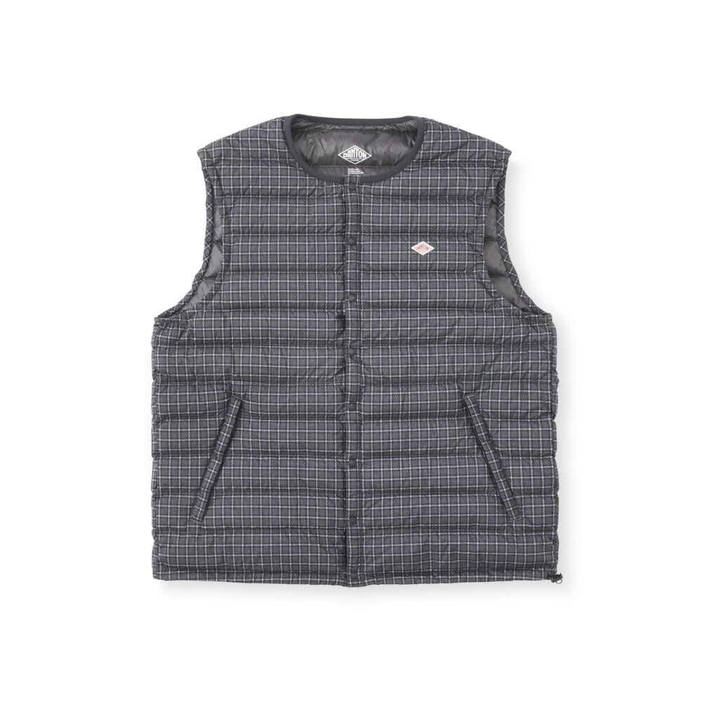 ふだん使いしやすいシンプルデザインのダウンベスト。6色展開のほかに、ポリエステル100%のインクジェットプリントを生地にチェック柄を細かく表現した「PLAID」柄も。
