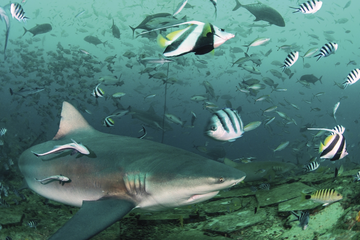 サメたちのまわりには小さな魚が多数泳いでいて、まさに竜宮城!(Frogfish Photography提供)