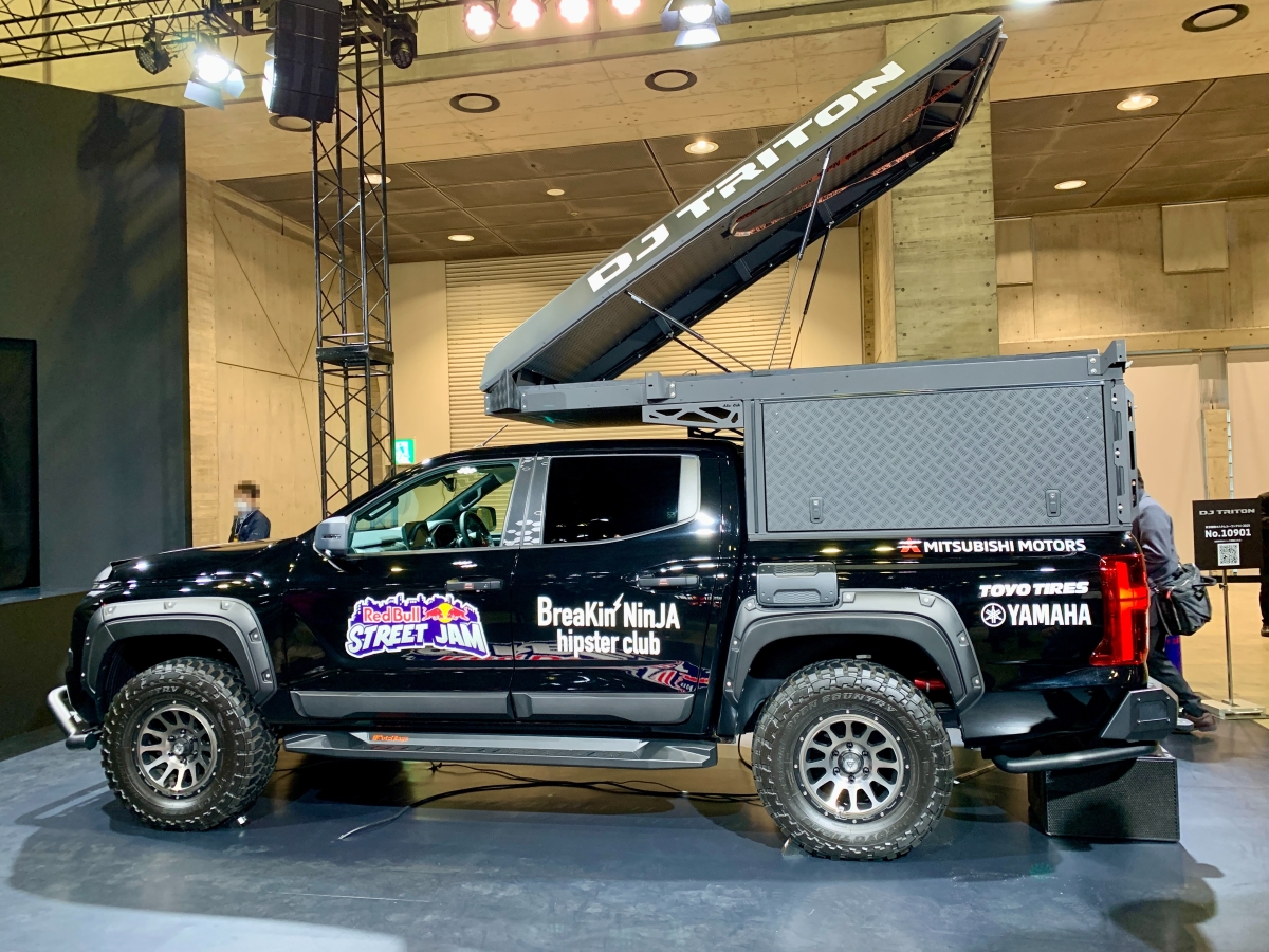 三菱自動車の「DJトライトン」。レッドブル・ジャパンとのコラボモデルで、荷台には実際にプレイ可能なDJブースを設置し、公道走行可能。イベントでも実際に使用されている。