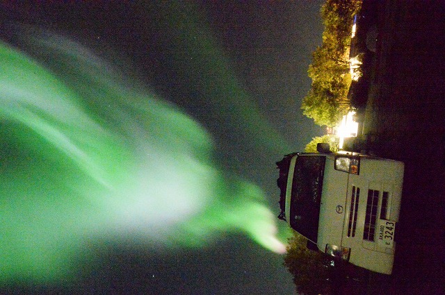 夜、オーロラ降臨。嵐のように激しく。いつまでもぐるぐるとうねうねと。我が家の軽自動車にエネルギーを!