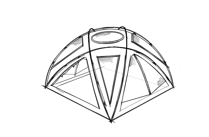 四角い床のドーム状で、外フレーム式の大型シェルター。大木さんがいう「ogawaらしくない」テントの最新版だ。4本のポールはすべて同じ長さだから、迷うことなく簡単にたてられる。