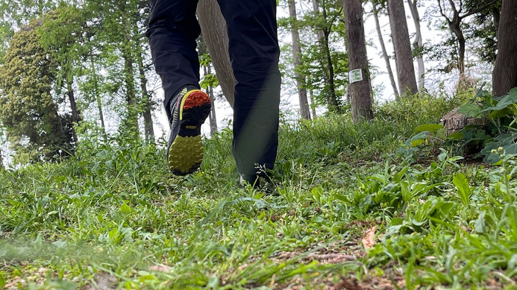 階段を上がっていても、フィット感があり不快感は感じなかった。履き口に付いている別生地により、ほかの商品でよくあるアキレス腱の擦れがほぼなく、スイスイと登っていける。今回は簡単なハイキングで試してみたが、終日かけて登り降りする長距離トレイルでも活躍しそうな気がした。