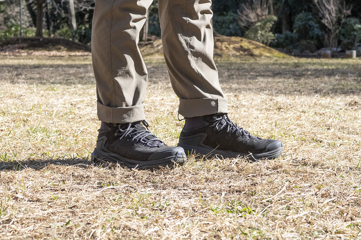 ここからは、実際に履いてみた感想を紹介しよう。履いているパンツはレギュラーフィットのモンベル「O.D.パンツ ライト」で、立っている状態ではくるぶし部がちょうど隠れる。幅はややワイドに設定されており、幅広甲高である筆者の足ならピッタリで、所感としてはひと言、快適だ。