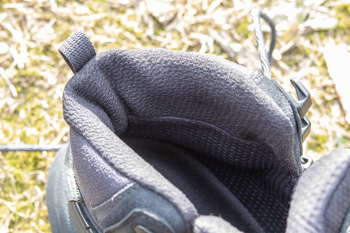 履き口には肌触りのいい別生地が付いている。見た目以上に厚みがあり、圧迫感がなく歩いていても足首が痛くなりにくい。前作は別部品が付いていて、アキレス腱にピッタリ付くような構造だったが、本作のほうがアキレス腱を覆うようにできているためフィット感が高いように感じた。