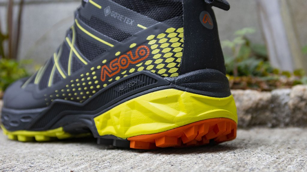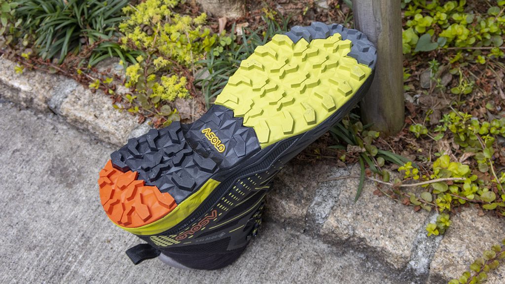 このアウトソールは以前に紹介したアゾロの「エルド MID レザー GV」と異なっている。「エルド MID レザー GV」は岩場でのグリップ力を重視しており、比べるとラグの深さからパターンのデザインまでまったく異なる印象。タホ MID GTXのほうがラグが深く、泥はけがいいので土のトレイルで威力を発揮しそうだ。