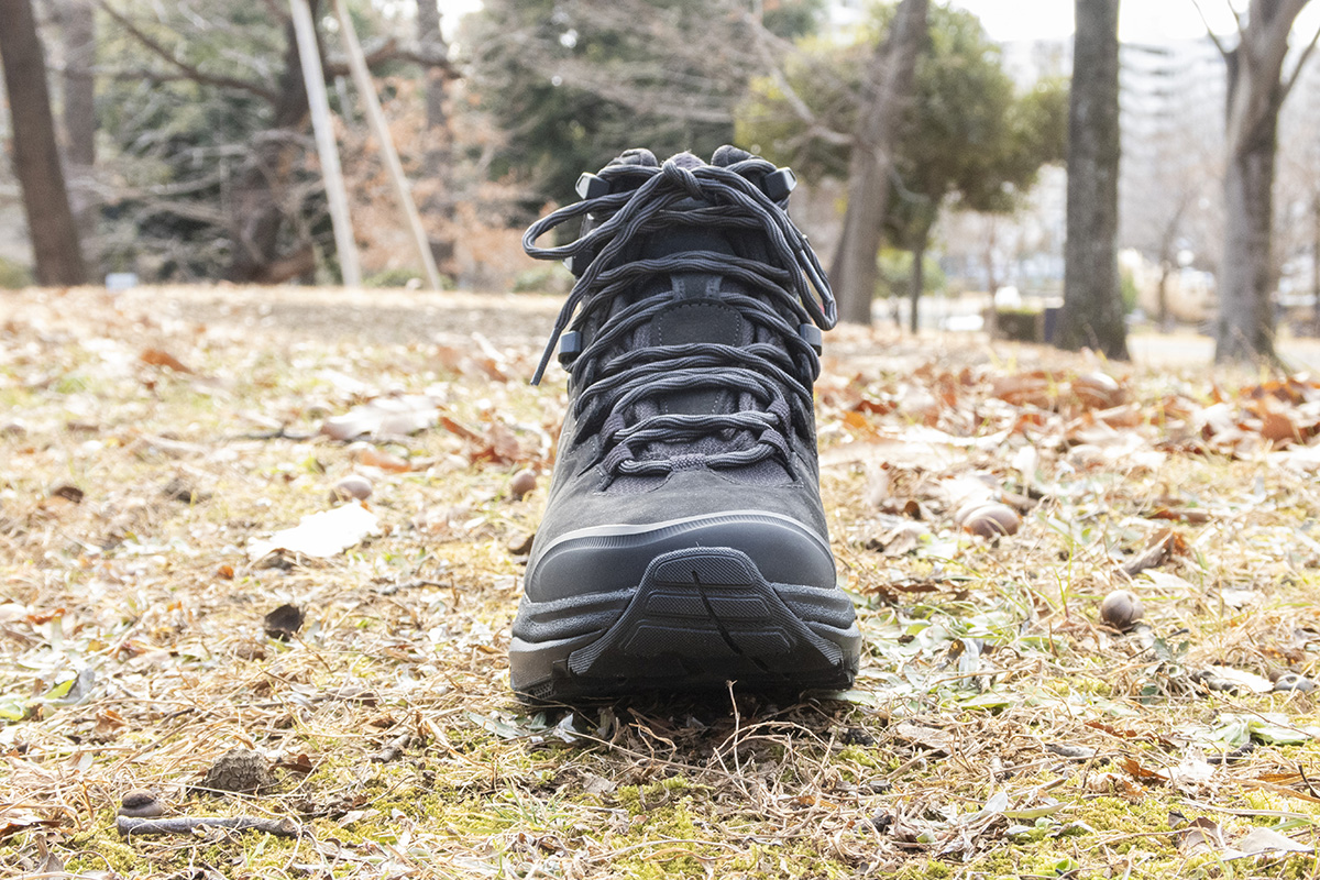 窮屈に感じたのは最初で、歩いて慣れていけば快適。ラグがアウトソール全体に配しているためか、ブーツがしっかりと地面をつかみ、足先に力を入れなくても楽に蹴り出しができた。