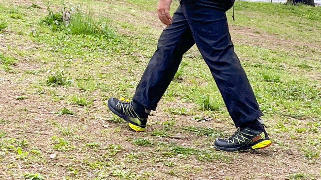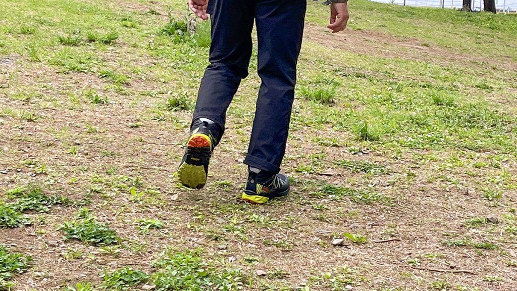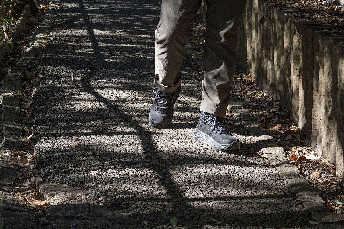 ローカットの柔らかさとハイカットの保護性を兼ね備えているので、ある程度足首が固定されつつも、普段に近い形で歩くことができる。