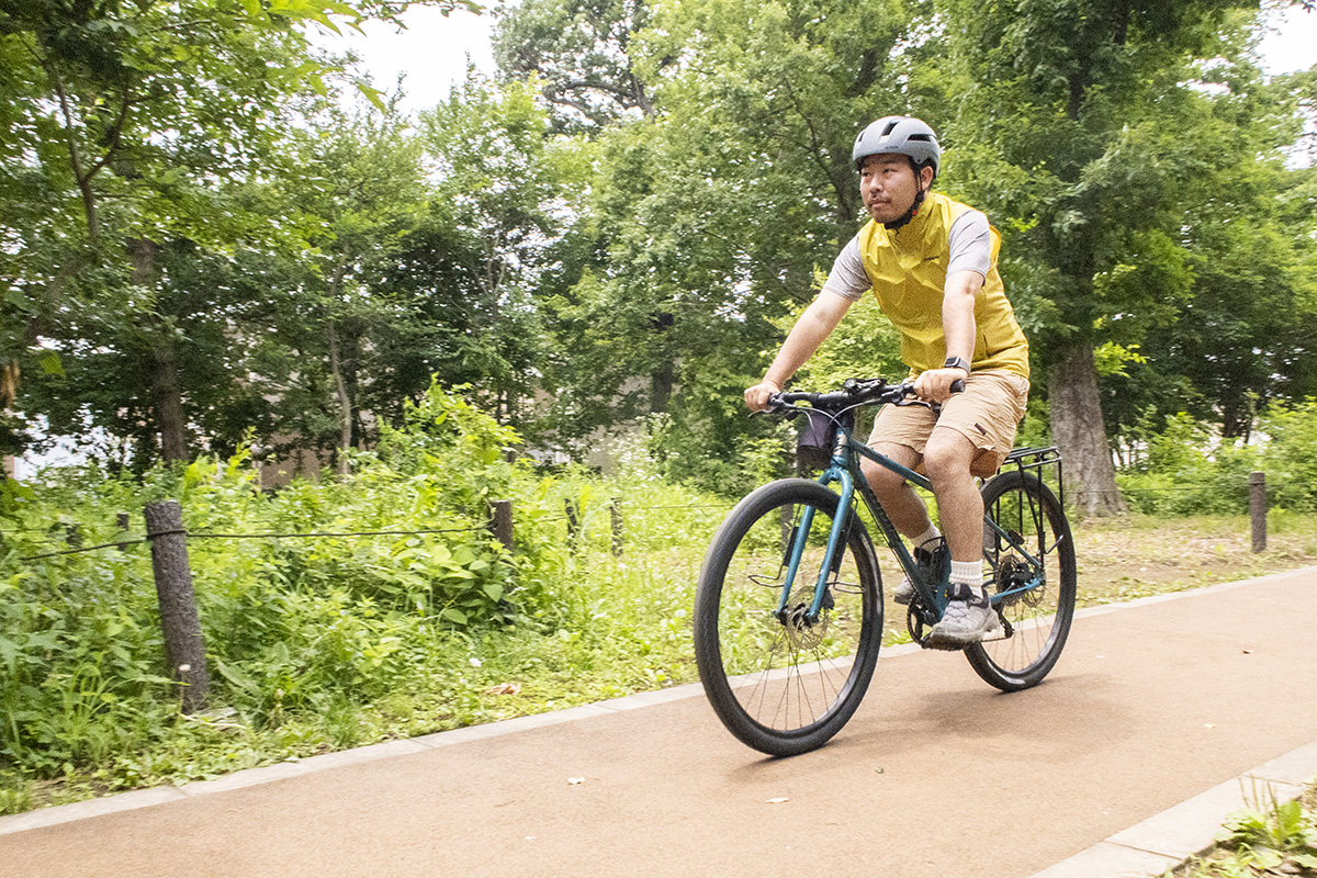 「トレイル・クラフト・ベスト」はバイク用とのことで、実際に自転車に乗って着心地を試してみた。中にはパタゴニアの「キャプリーン・クール・デイリー・シャツ」を着用。インナーだけでも十分涼しいが、風をもろに受けると体が急速に冷えそうだったので、ベストを羽織ってある程度の風を防ぐ。
