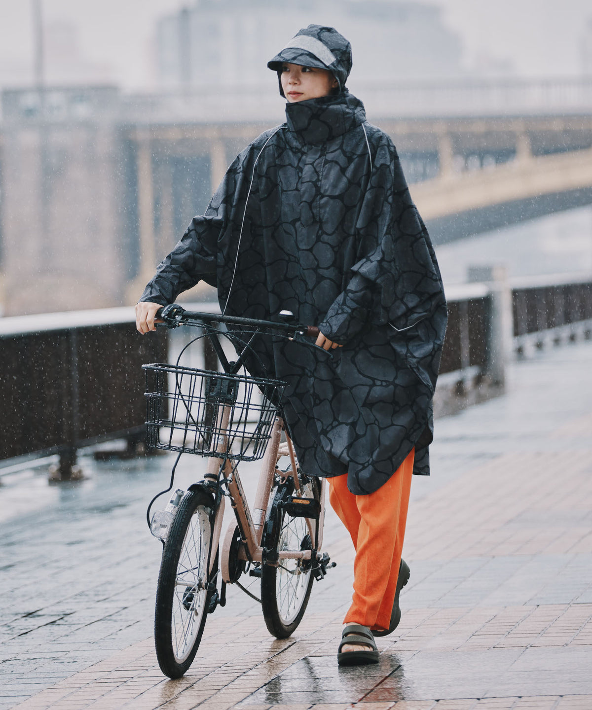耐水圧約10,000mmのはっ水・防水加工生地を採用した、レインコートです。袖付きアノラック型デザインの採用により、自転車走行中のスムーズな動きやバタつきの抑制が実現されています。